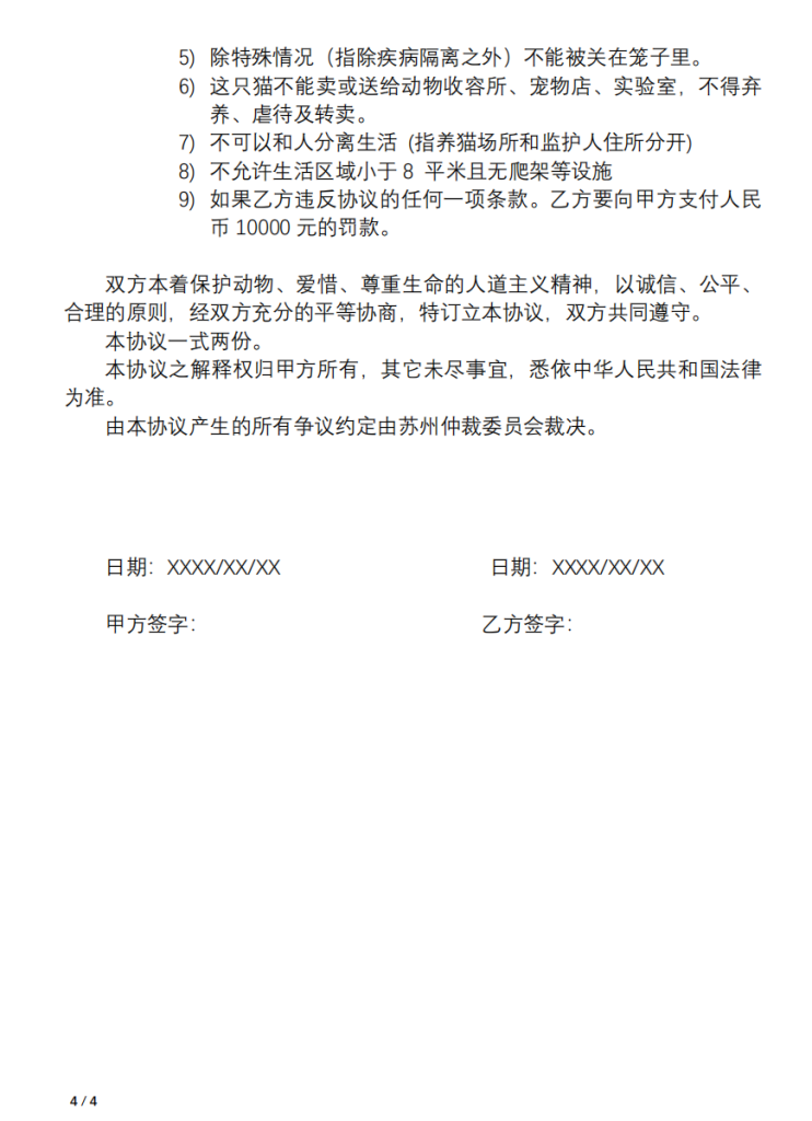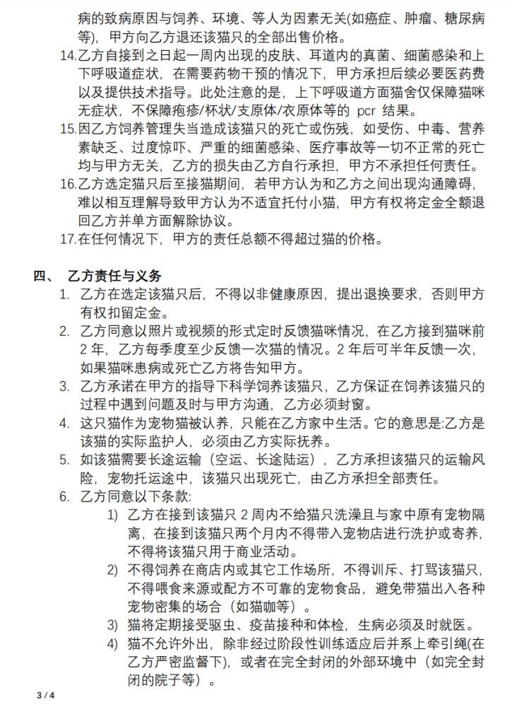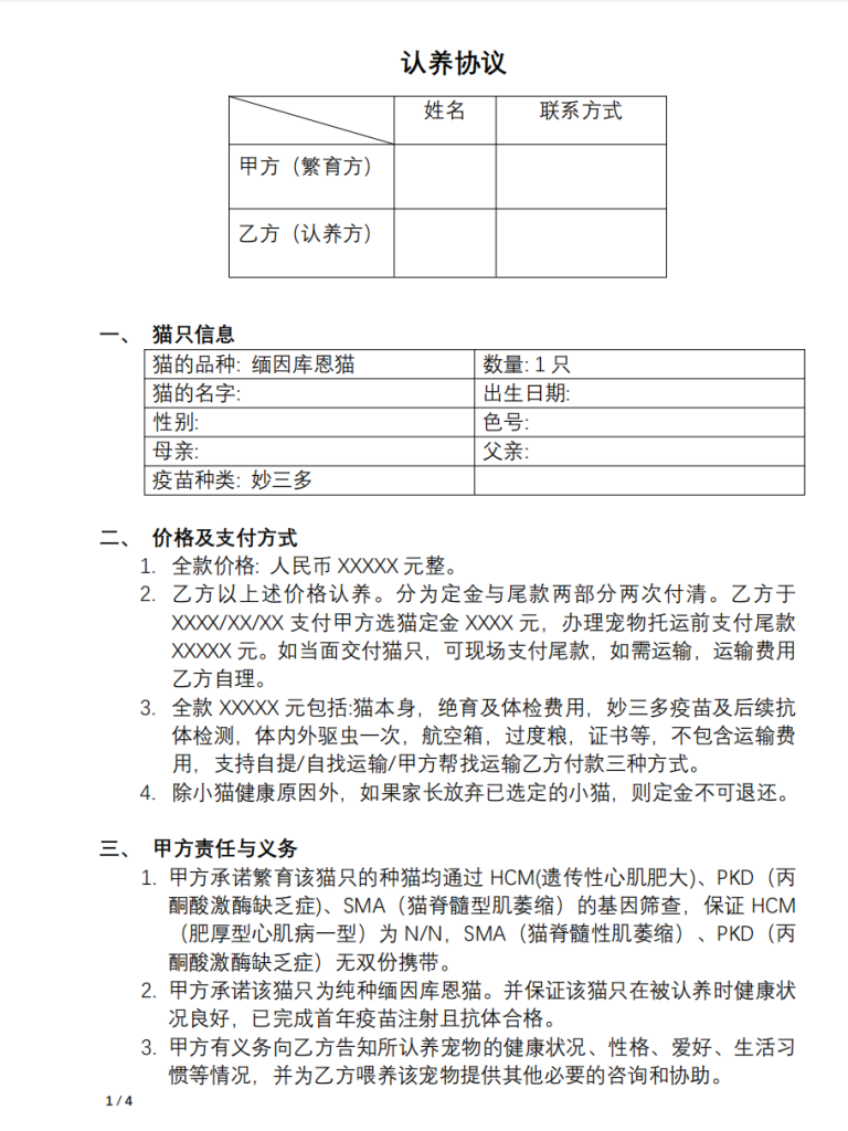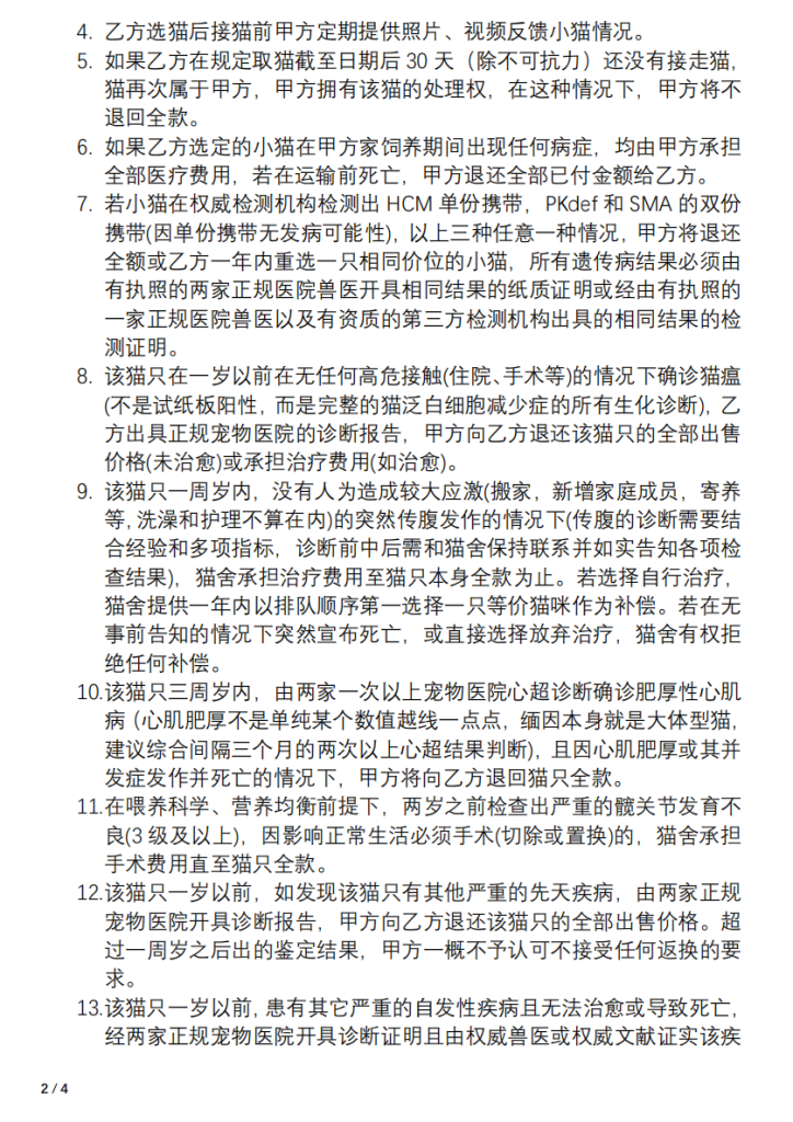 遗传病(HCM1、PKDef、SMA)终身保障:猫舍所有一代种猫均通过HCM1(遗传性心肌肥大)、PKDef(丙酮酸激酶缺乏症)、SMA(猫脊髓型肌萎缩)的基因筛查,如果经正规基因检测机构检测结果显示接走的小猫携带HCM1或双份携带SMA或PKdef,猫舍将退全款。猫瘟:小猫去新家前会完成三针妙三多疫苗接种并且进行抗体检测确保已经产生足够的抗体,小猫一岁以前若确诊猫瘟且导致死亡,家长提供正规医院的诊断报告的前提下,猫舍将退全款。猫传腹:引起冠状病毒变异的原因不明确,很少有猫舍会保障猫传腹,但猫舍的每只小猫都是经由我带到这个世界上的,我会对其负责,如果小猫在一岁以前确诊猫传腹,家长提供正规医院的诊断报告,猫舍承担其治疗费用至猫只全款为止。肥厚型心肌病:小猫三岁前因患肥厚型心肌病导致死亡,家长出具两家正规宠物医院的诊断报告或尸检报告的前提下,猫舍将退全款。髋关节:小猫两岁之前检查出严重髋关节发育不良(3级及以上),影响正常生活必须手术切除或置换的,猫舍承担手术费用直至猫只全款。真菌、细菌感染及呼吸道问题:自接猫之日起一周内出现的皮肤、耳道内的真菌、细菌感染和上下呼吸道症状需要药物干预的,猫舍承担100%的治疗费用且提供治疗方案。其他严重先天性疾病:小猫一岁前,如发现患有其他严重的先天疾病,由两家正规宠物医院开具诊断报告,退全款。其他严重自发性疾病:小猫一岁前如检查出患有其它严重的自发性疾病且无法治愈或导致死亡,经两家正规宠物医院开具诊断证明且由权威兽医或权威文献证实该疾病的致病原因与饲养、环境、等人为因素无关(如癌症、肿瘤、糖尿病等),退全款。 合同模板如下: